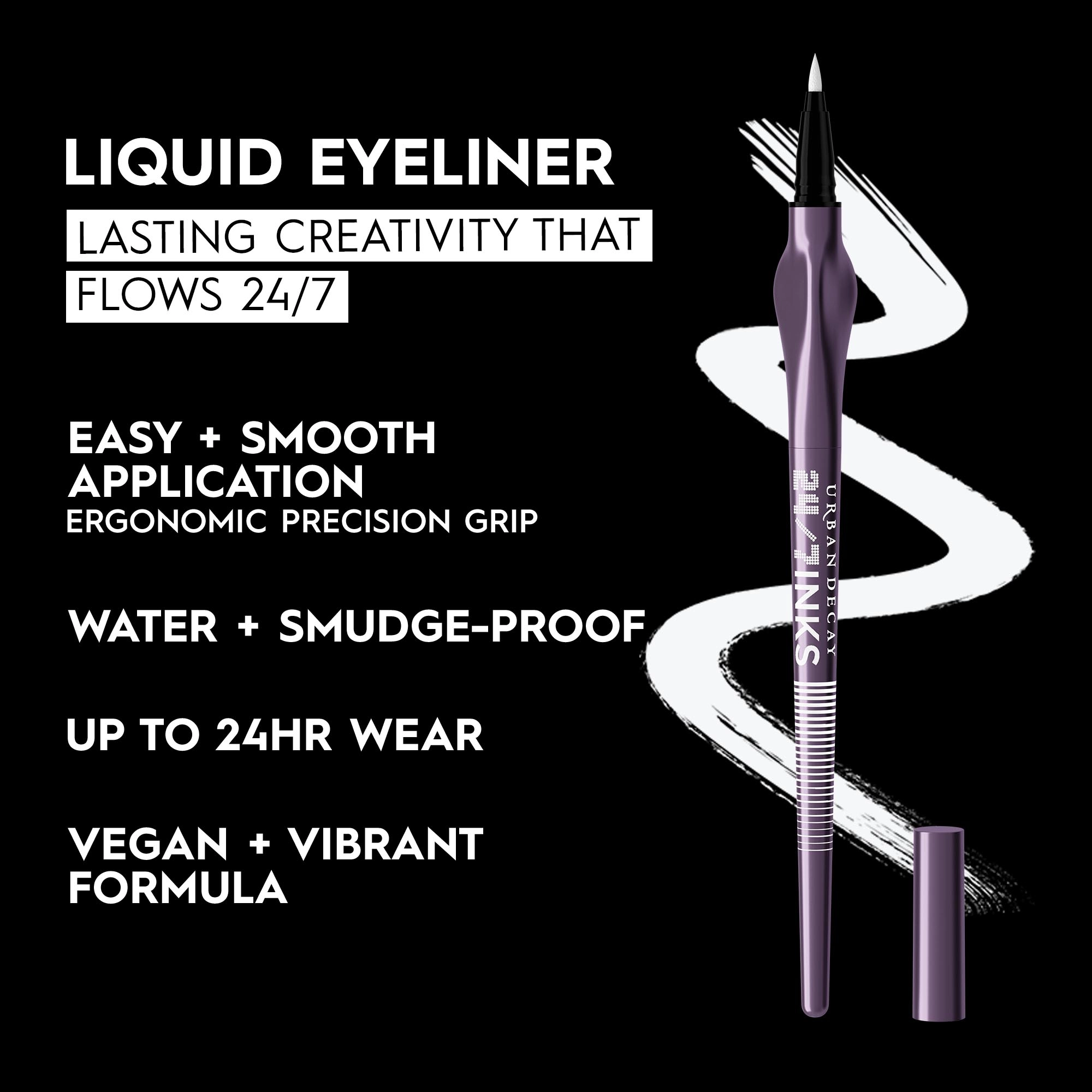 Shake the Urban Decay 24/7 Inks Easy Ergonomic Liquid Eyeliner Pen before applying to ensure the formula is well-mixed. With the flexible, ultra-fine eyeliner tip, you can easily draw thin or thick lines without skipping, dragging, or pulling on delicate skin. For a more fluid application, hold the end of the paintbrush-inspired handle and create swirls of color or dreamy doodles.