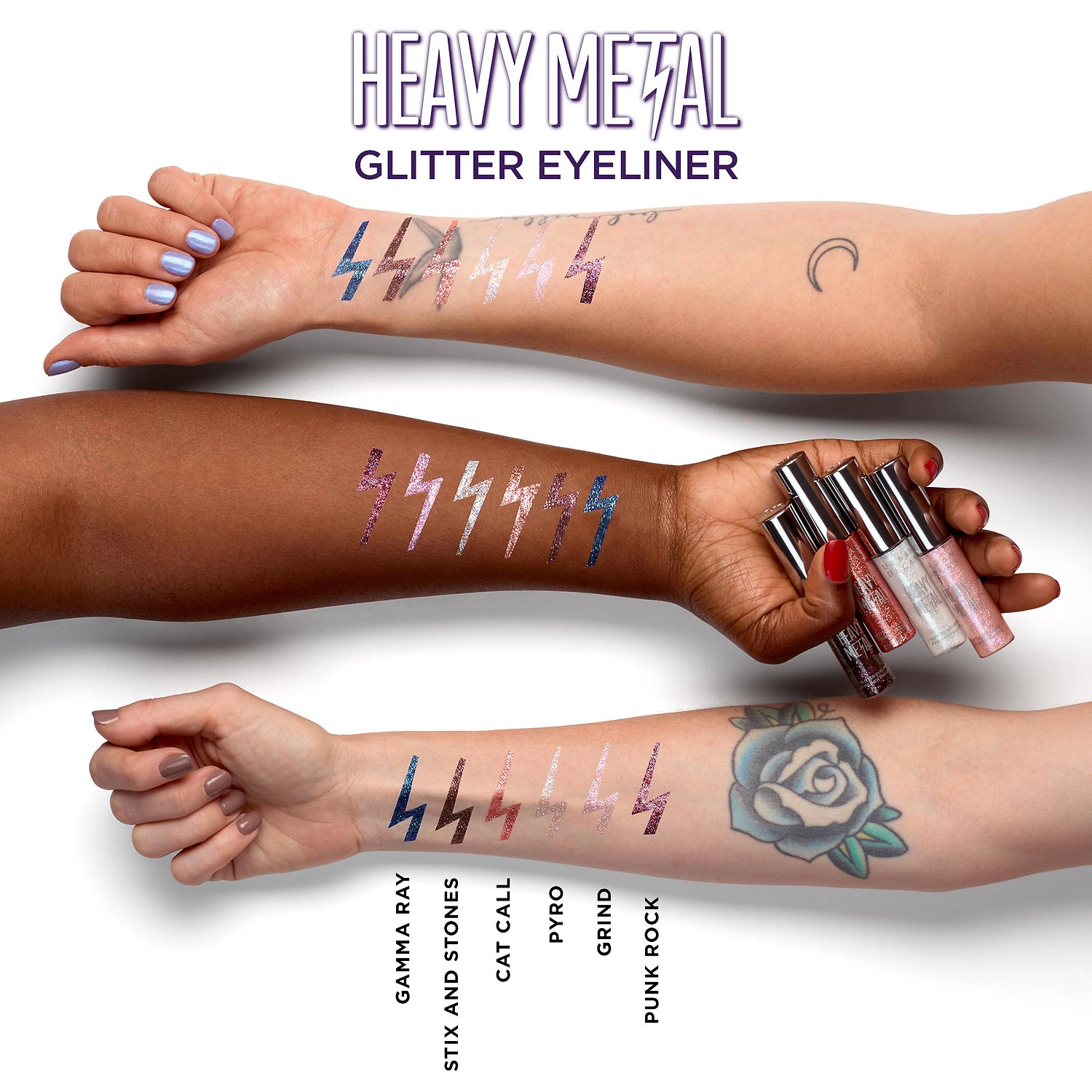 For fine, glittery lines, use the precise, thin-tipped brush included with the eyeliner. Want more sparkle? Use the side of the brush to sweep the glitter all over your lids. For an even bolder look, remove the wiper from the bottle and tap the Heavy Metal Glitter Eyeliner onto your lids with your fingers. The gel-based formula ensures the glitter stays suspended and won’t separate in the bottle.