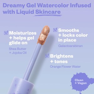 With its gel watercolor texture, this eyeshadow glides on effortlessly and feels lightweight on the lids. The unique formula is infused with liquid skincare ingredients that not only provide beautiful color but also nourish and care for your skin. The Galactoarabinan ingredient helps smooth the appearance of the skin, while Jojoba Oil soothes and balances. The Orange Flower Water brightens and tones the skin.