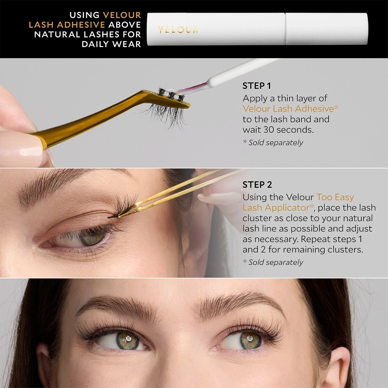 Step 2: Apply Velour Multi-Day Lash Bond (sold separately) across the top of Velour-Xtensions™ Lash Cluster and to the underside of your natural lashes. Wait until the formula is tacky.