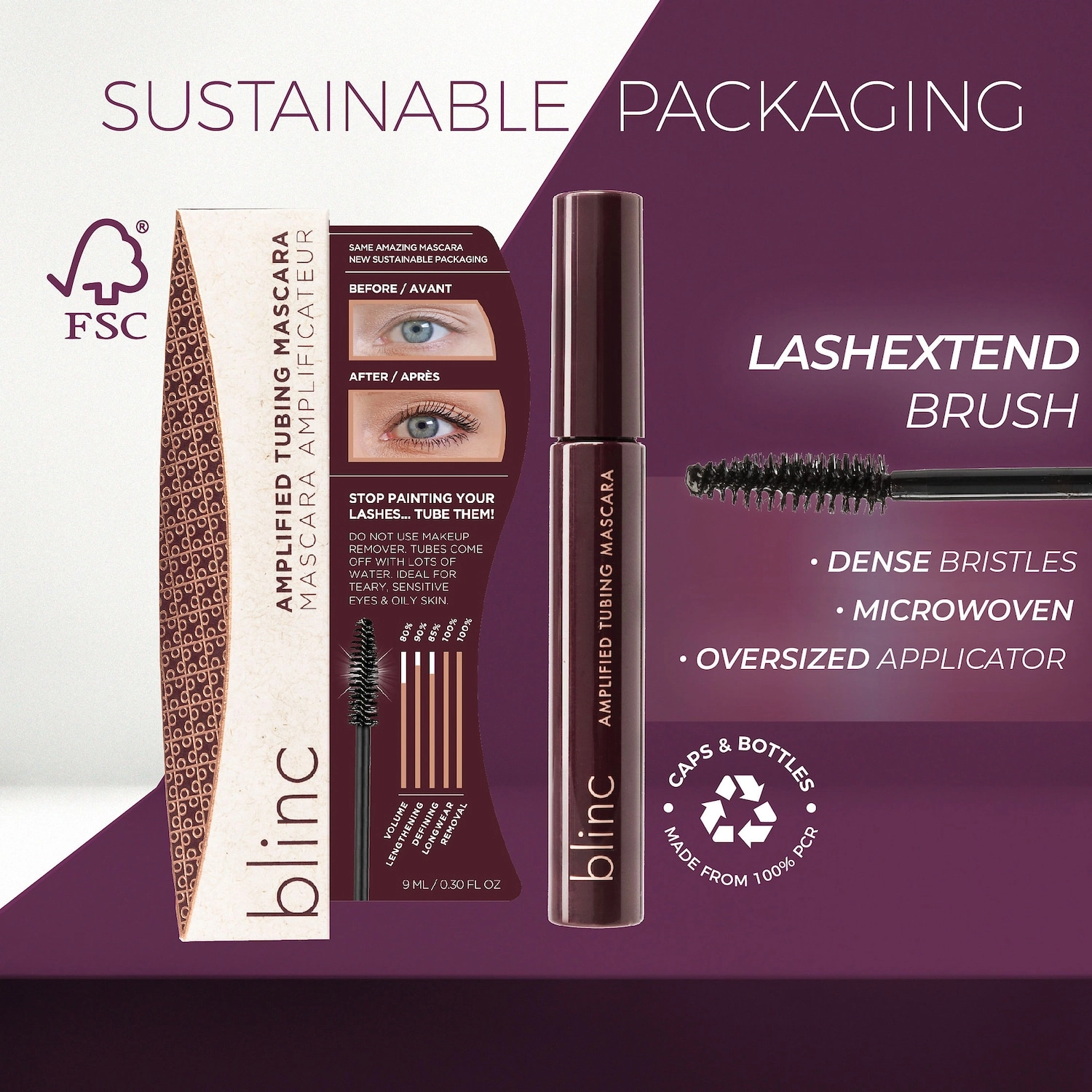 - The unique tube-forming technology of Blinc Mascara Amplified allows the tiny water-resistant “tubes” to effortlessly slide off your lashes, leaving no messy black tint or residue behind.