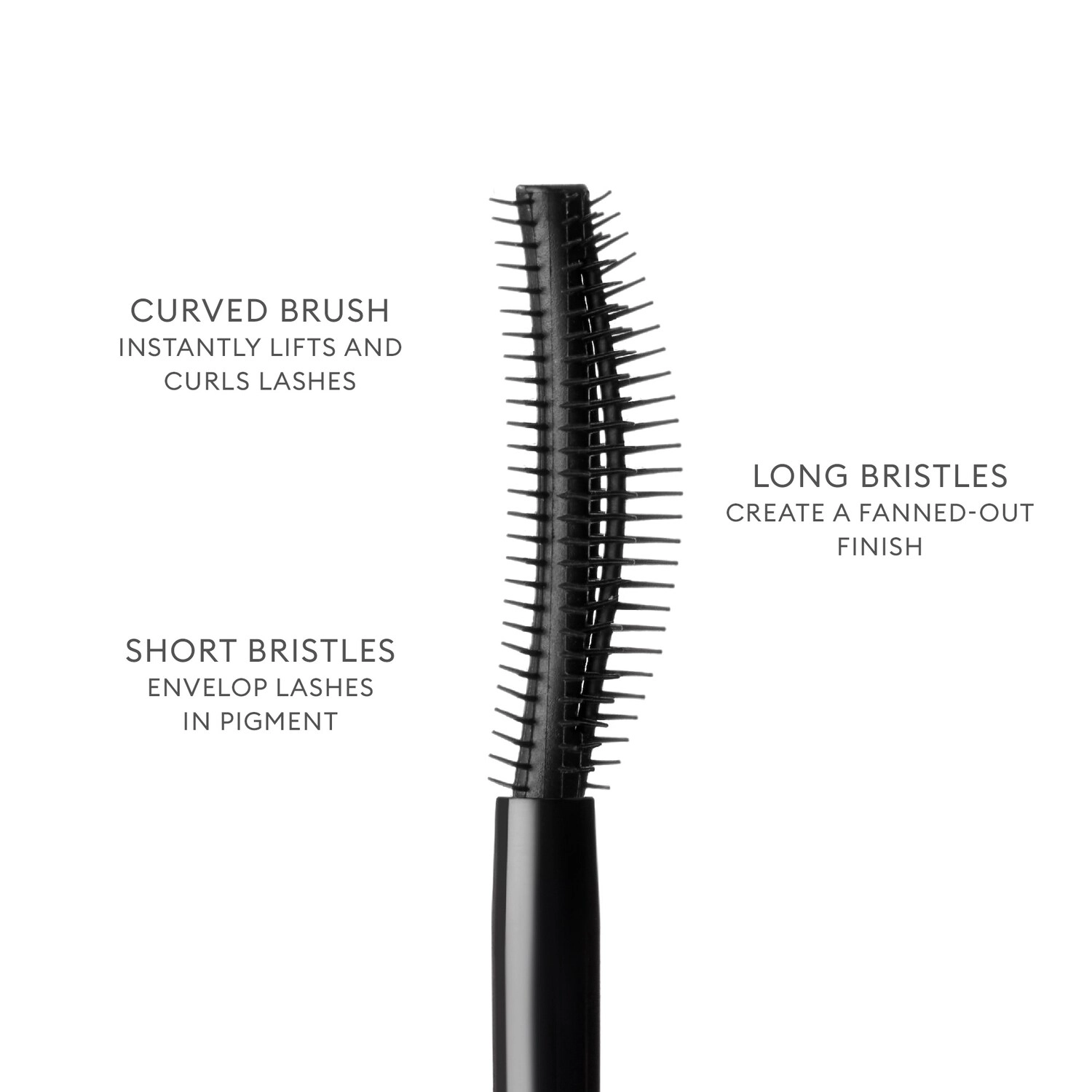 - Use the curved side’s short bristles to coat lashes.