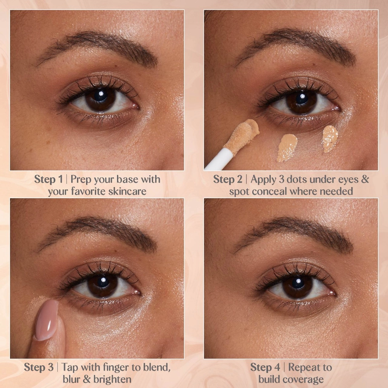 To blur and brighten, simply dot the concealer onto skin and blend with your finger or brush. Repeat to build coverage. For best results, try using the HUDA BEAUTY Face Conceal & Blend Brush (sold separately). Apply three dots under each eye and press the product into the skin to avoid tugging the delicate eye area. You can also use this concealer on the browbone, inner corner of the eyes, or high points of the face for a natural highlight.