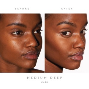 For the first step of the Fenty face, create a soft, matte base by swiping the Matte Skinstick onto your skin. Blend it with your fingers or with the Portable Contour & Concealer Brush for a seamless finish. To ensure smooth application, warm the product on the back of your hand before tapping it onto your skin.