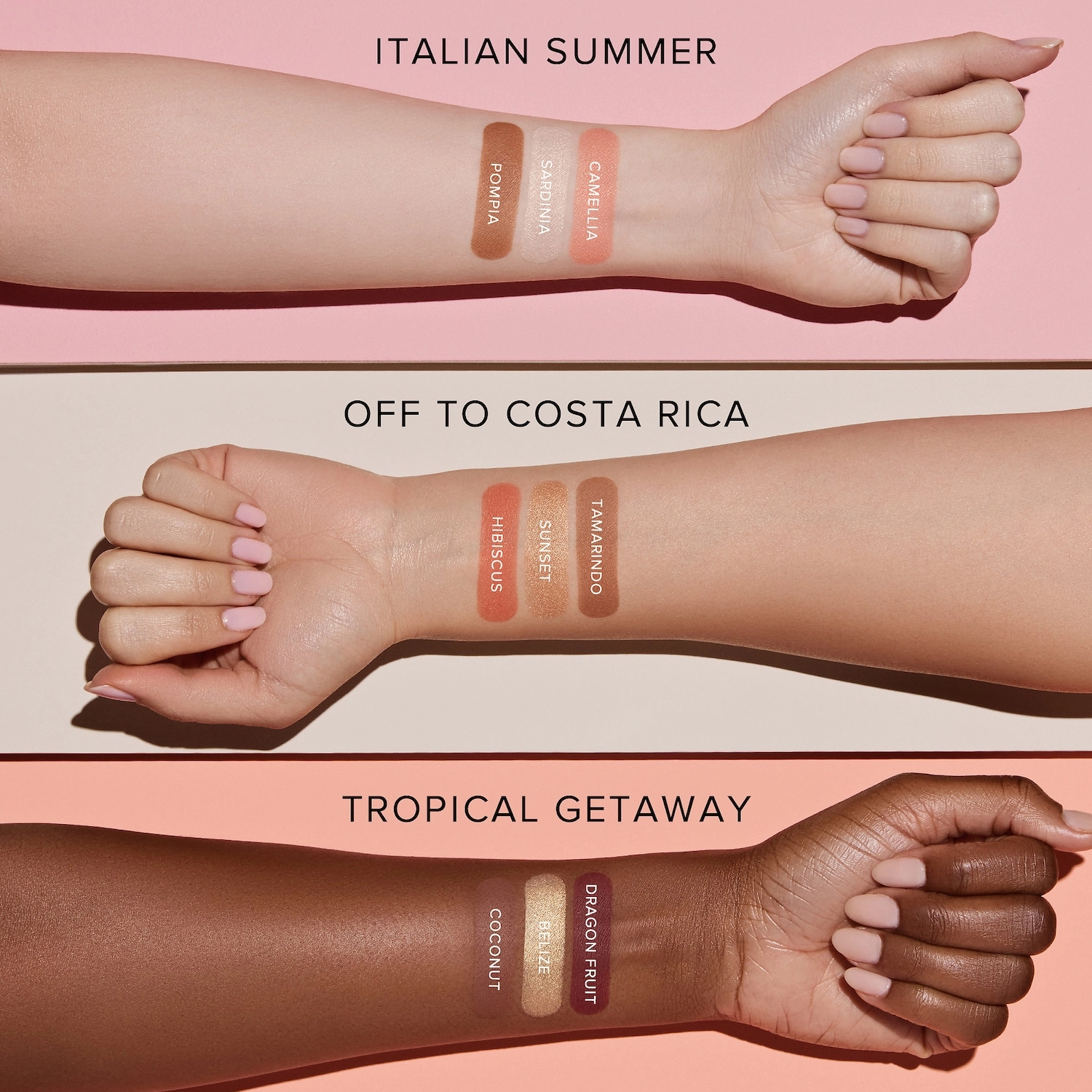 Off To Costa Rica palette transports you to sun-soaked destinations. Embrace the sultry charm of Tamarindo bronzer, the luminous allure of Sunset Beach highlighter, and the rosy glow of Hibiscus blush. Together, they craft a radiant look that exudes the essence of Costa Rica.