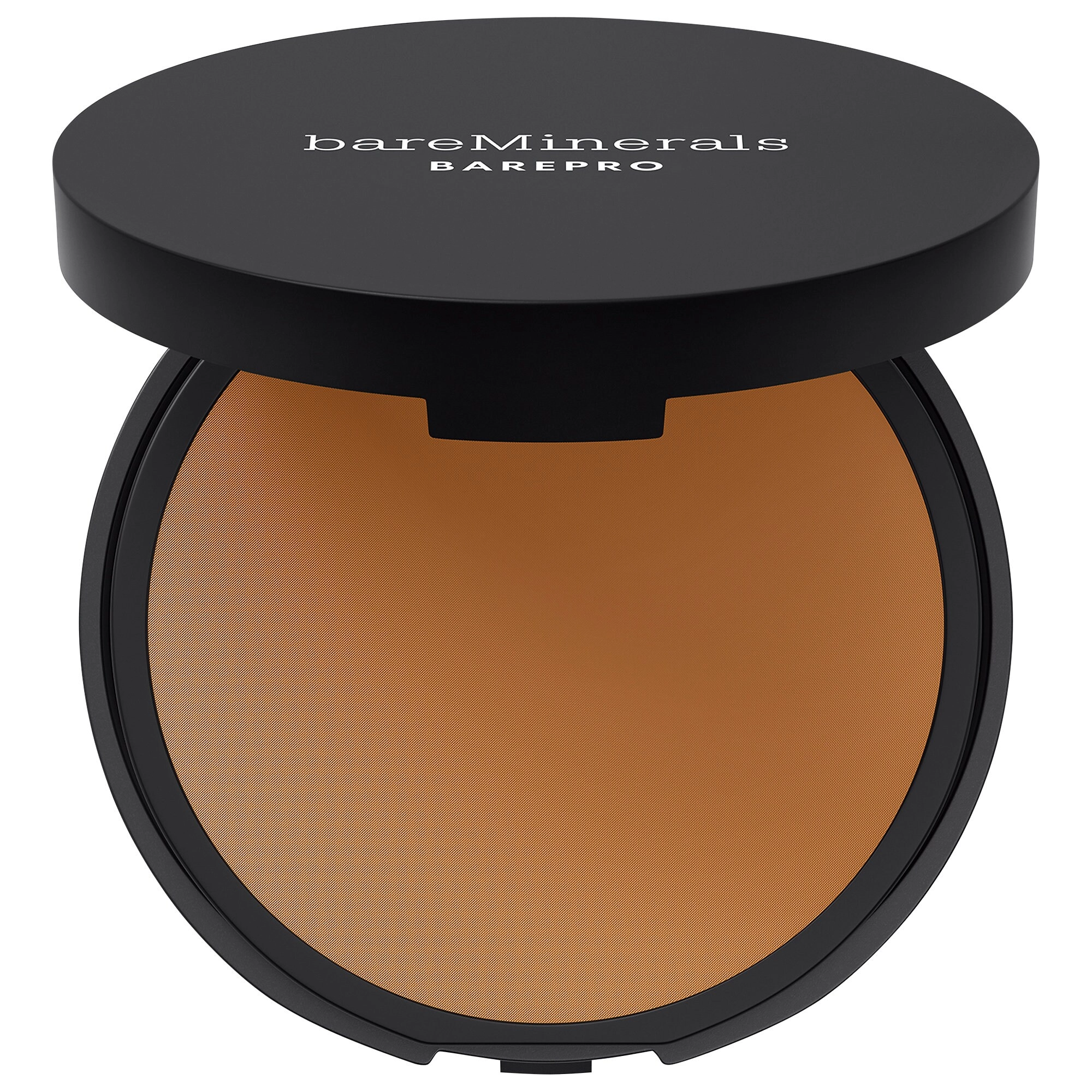 Achieve a flawless complexion with the bareMinerals BAREPRO 16-HR Skin-Perfecting Powder Foundation. This full coverage, matte finish powder foundation is perfect for dark neutral skin with a subtle golden hue. The vegan and long-wearing formula provides a flawless complexion that lasts all day. Prep your skin with the Skinlongevity Long Life Herb Anti-Aging Face Serum for smoother, easier makeup application. Use the BAREPRO Core Coverage Brush for buildable coverage. Sweep the brush along the powder and swipe onto your skin using downward strokes. The synthetic fluorphlogopite, silica, and zinc oxide in the formula help to even out skin tone and texture over time. The Pineapple Complex brightens and smooths skin texture, while the Peony Extract and Sugarcane-Derived Squalane hydrate and nourish for visibly smoother, more even skin. The sweat-, humidity-, and transfer-resistant formula provides up to 16 hours of oil and shine control. Whether you have normal, dry, combination, or oily skin, this pressed powder foundation is perfect for you. Achieve a flawless complexion with the bareMinerals BAREPRO 16-HR Skin-Perfecting Powder Foundation.
