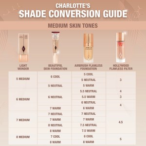 Apply Charlotte Tilbury Beautiful Skin Medium Coverage Liquid Foundation two ways for a natural, healthy-looking finish. Buff outwards from the center of the face, across the cheek, and down the jawline. Alternatively, pat on foundation to key areas that need more coverage, then gently blend out in circular motions all over the face. For enhanced results, set with Airbrush Flawless Finish Powder and Airbrush Flawless Setting Spray (sold separately).