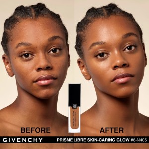 Apply the Givenchy Prisme Libre Skin-Caring Glow Foundation with your fingers for a dewy, translucent finish or use a brush or sponge for buildable coverage and correction. Start by applying the foundation to the T-zone, including the bridge of the nose and the forehead, then blend outward towards the cheeks. Gently pat the foundation with your fingertips to help the active ingredients penetrate the skin.