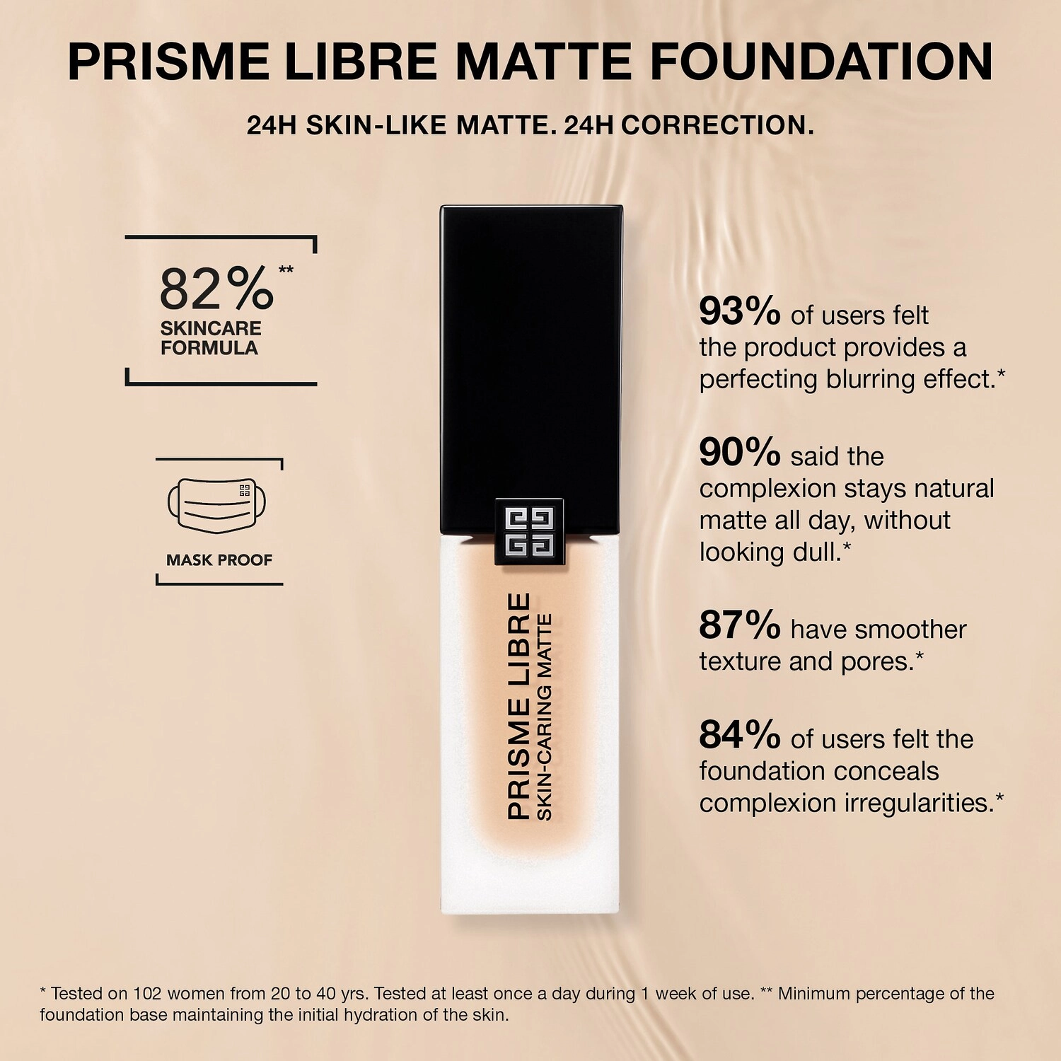 Experience natural matte perfection with Givenchy Prisme Libre Skin-Caring Matte Foundation. This lightweight and long-lasting foundation is formulated to blur imperfections and provide up to 24 hours of coverage. Made with 97% natural origin ingredients and 82% skincare formula, it not only enhances your complexion but also hydrates and reduces the appearance of pores.