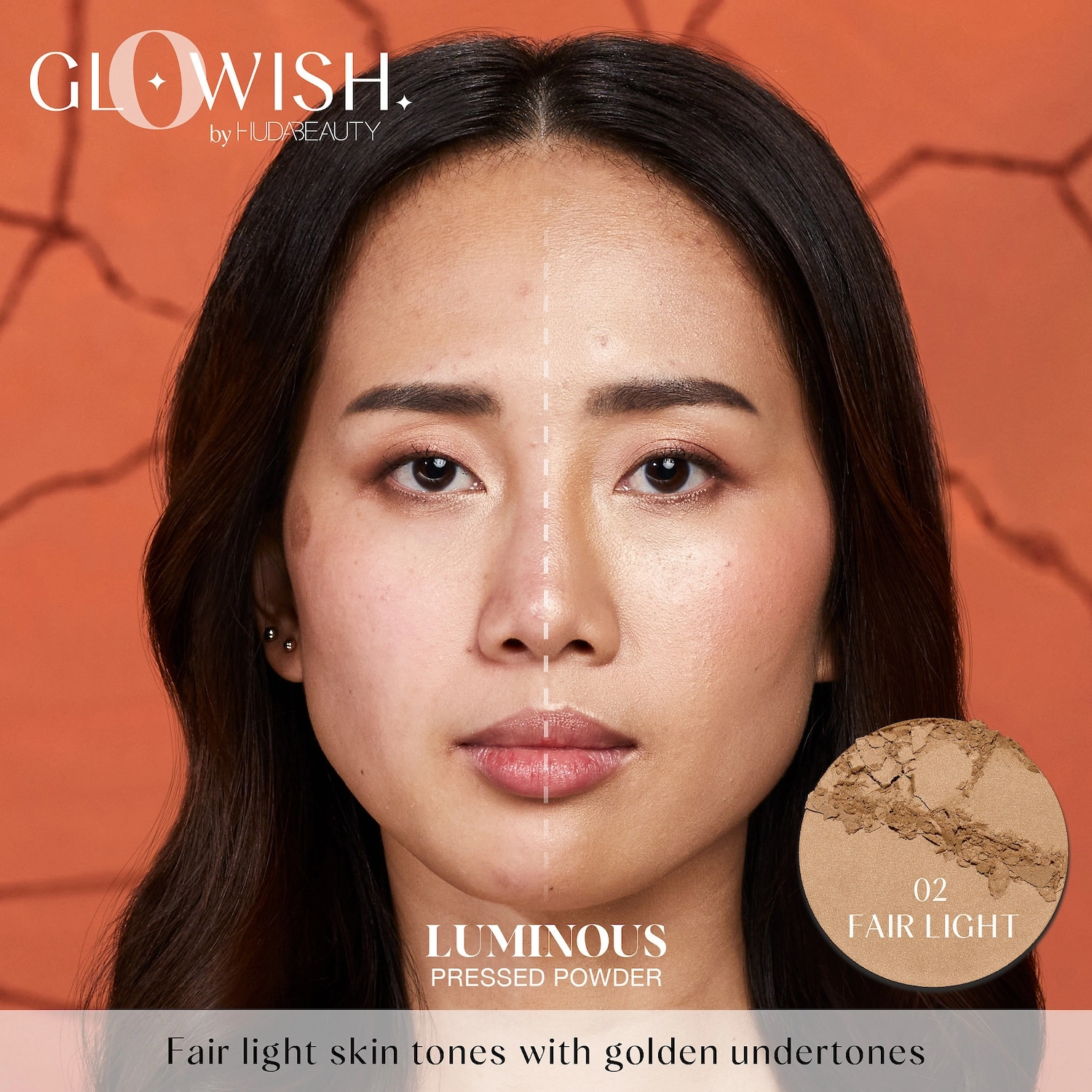 Experience the flawless radiance of HUDA BEAUTY GloWish Lightweight Blurring Pressed Powder. This clean, vegan formula is designed to give you a natural, luminous finish without the heavy cakey feeling. With its lightweight texture and buildable coverage, it blurs imperfections and leaves your skin looking flawless and radiant.