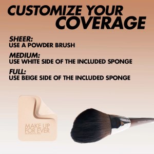 For application, prep your complexion with your favorite skincare or preferred primer. Start applying the foundation from the center of your face, blending it outwards for an even coverage. If you prefer sheer coverage or want to set your makeup, use a powder brush. For medium coverage or touch-ups throughout the day, use the white side of the included sponge. And for full coverage, apply and build with the beige side of the sponge.