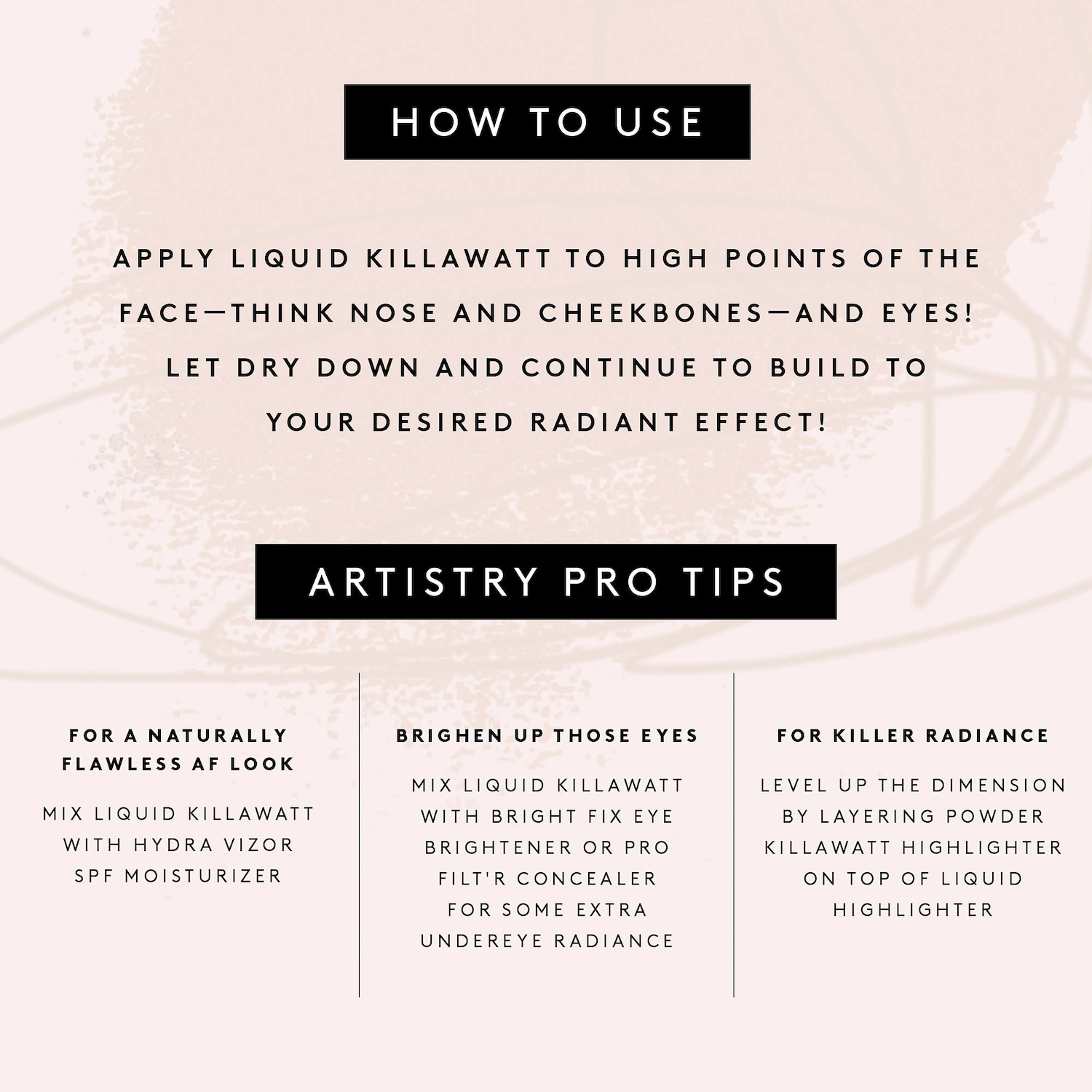 To achieve a radiant effect, apply the Liquid Killawatt to the high points of your face, such as the nose and cheekbones. You can also apply it to your eyes for an extra pop. Allow it to dry down and continue to build until you achieve your desired level of glow. For an even more intense highlight, layer any original Killawatt Freestyle Highlighter on top of the Liquid Killawatt.