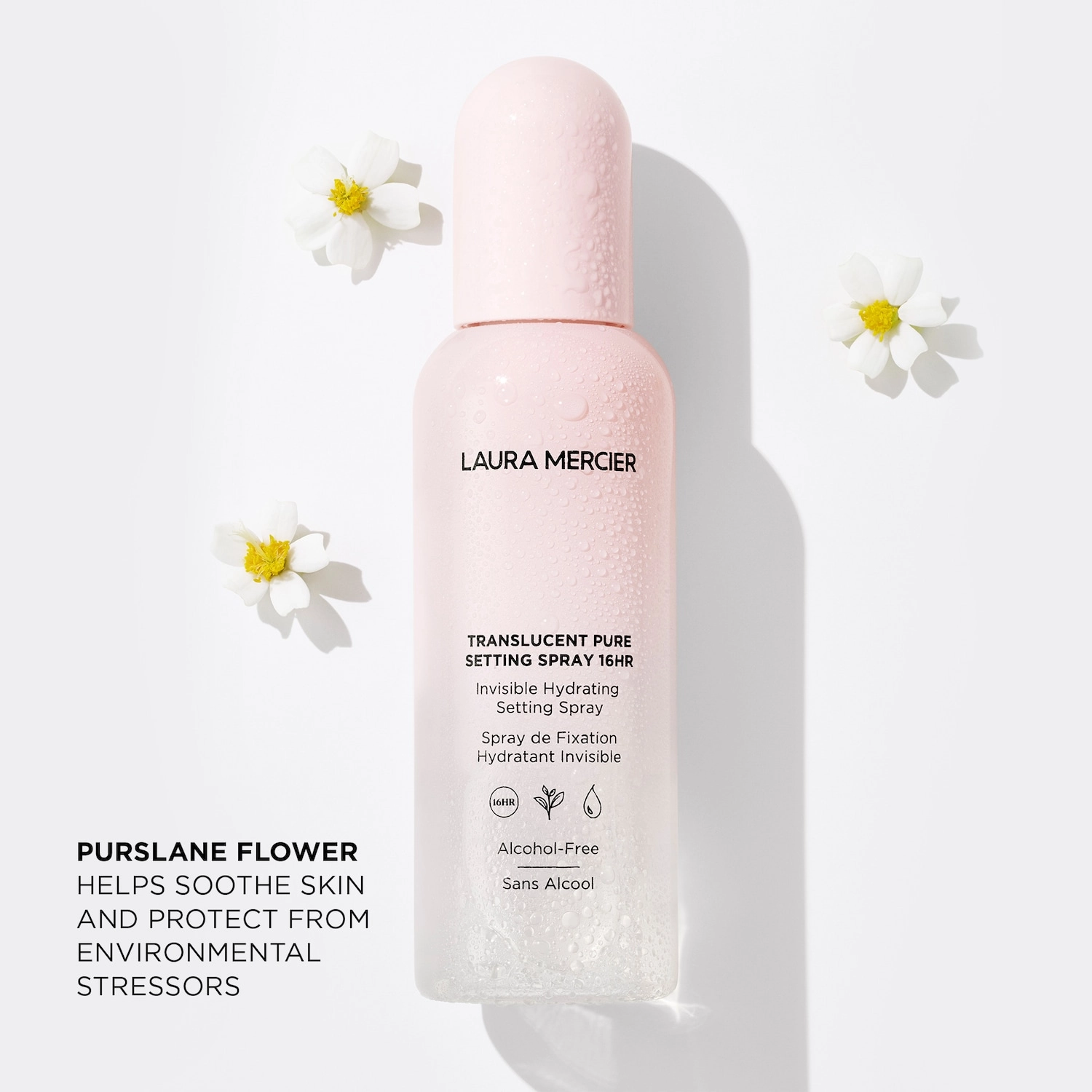 Use Laura Mercier Translucent Pure Setting Spray as the final step of your makeup routine to set your makeup for up to 16 hours of comfortable wear. Shake the bottle well before use. Hold the bottle ten inches away from your face and close your eyes. Spray the skin one to three times in an oval pattern, starting from the outside of the face and working towards the center. The plant-derived matrix in the formula provides a breathable barrier against pollutants, while the purslane flower soothes, nurtures, and protects the skin. The glycerin-infused water gives a refreshing feel.