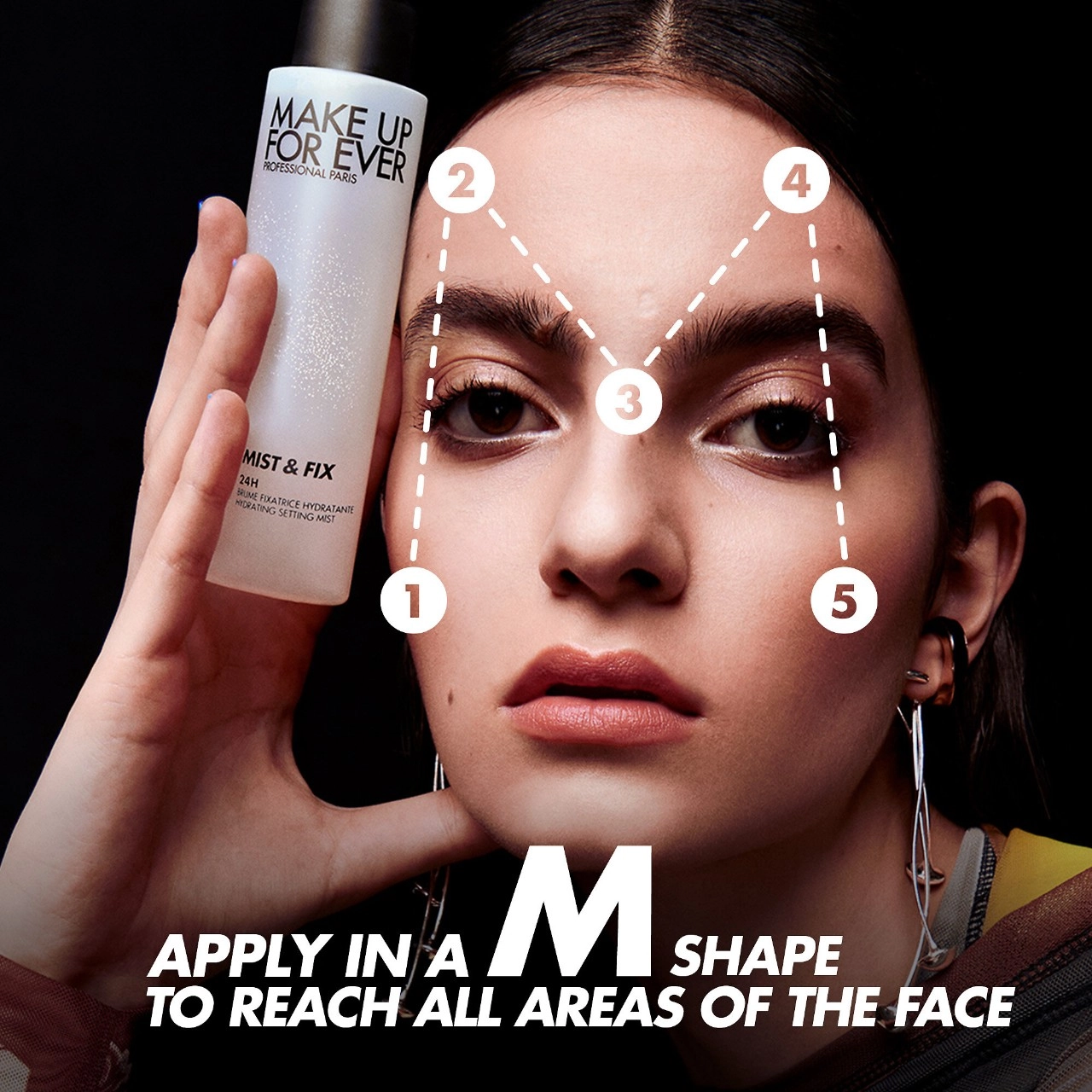 Experience the ultimate makeup setting spray with the MAKE UP FOR EVER Mist & Fix 24HR Hydrating Setting Spray. This alcohol-free, microfine mist is infused with hyaluronic acid and aloe vera, making it a must-have for any makeup lover.