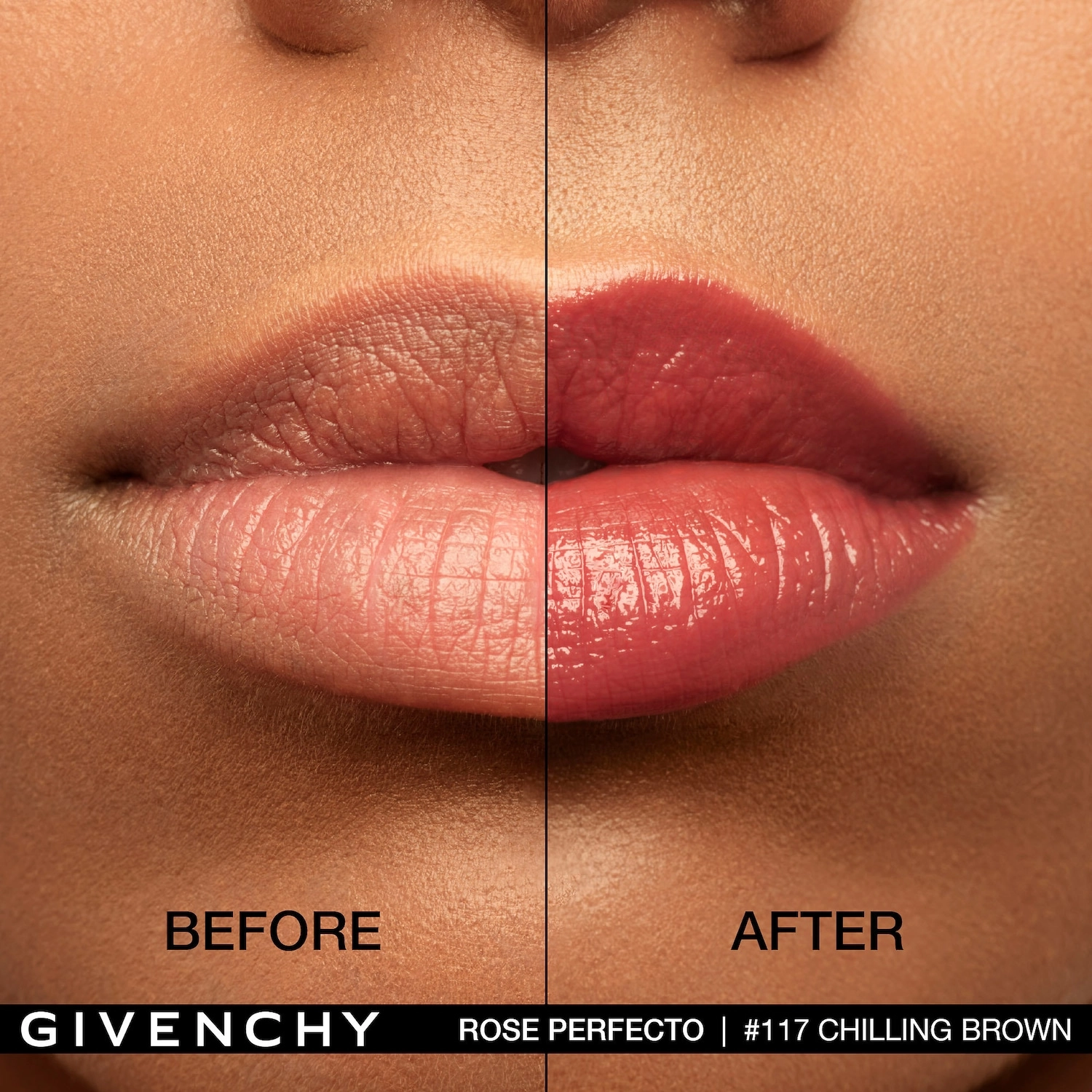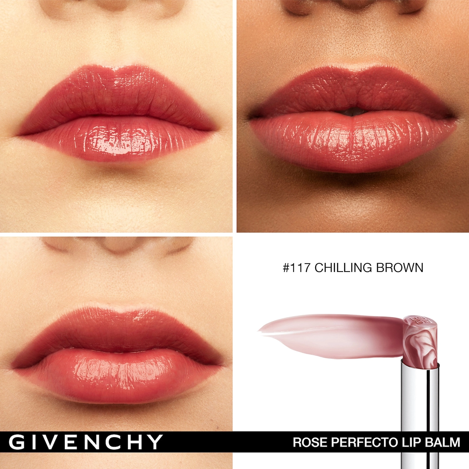 Indulge your lips with Givenchy Rose Perfecto Lip Balm 24H Hydration in the stunning shade 117 Chilling Brown. This skincare-infused lip balm is formulated with 95% natural origin ingredients, providing nourishment, plumping, and smoothing effects for up to 24 hours. With its high shine finish, this lip balm will give your lips a luscious and hydrated look.