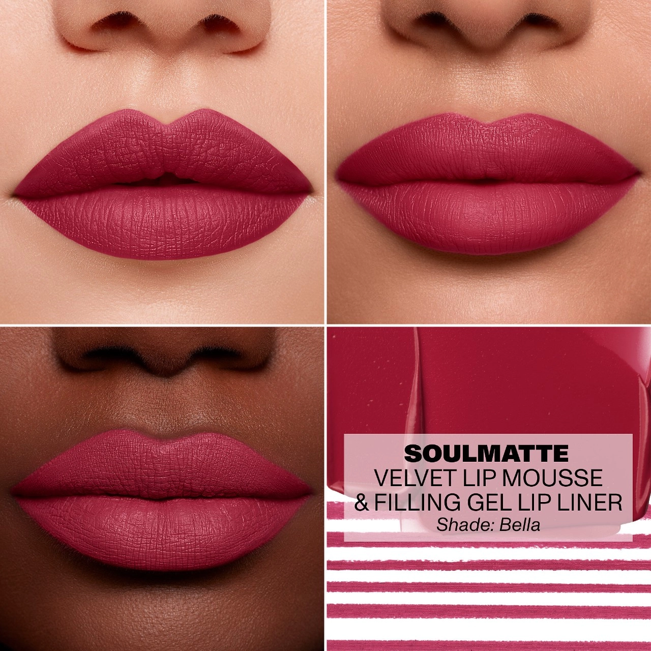 For a perfect application, twist up to reveal the tip of the liner and line your lips. Use the attached sharpener to create a precise point for a defined line. After lining, fill in your lips with the gel lip liner for a long-lasting color effect. For a bold look, mix and match different shades of the Soulmatte Filling Gel Lip Liner and Soulmatte Velvet Lip Mousse (sold separately). Try pairing Bella liner with Wifey mousse for a stunning red-pink ombre pout.