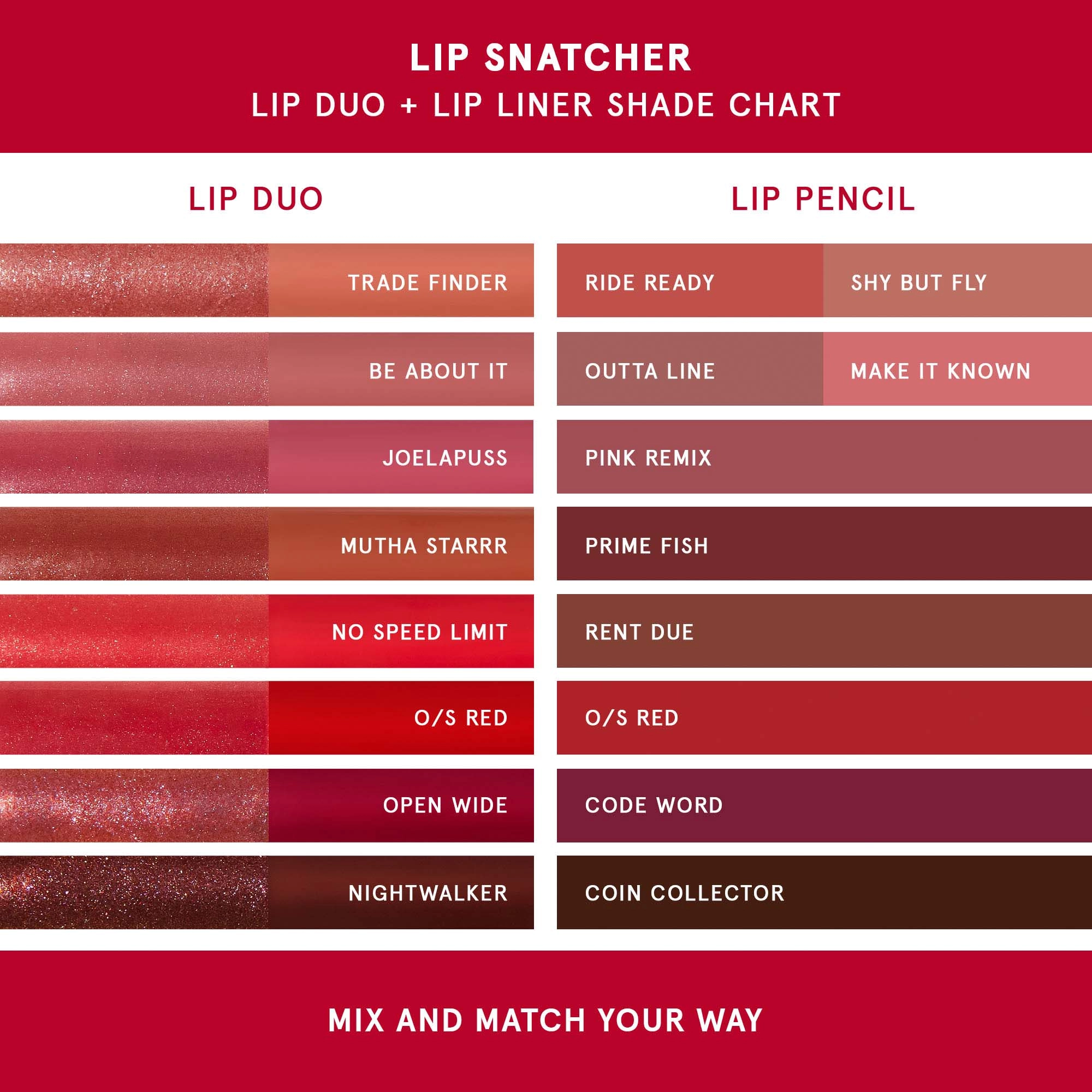 To create your desired lip shape, use a freshly sharpened pencil. For a natural shade, look at your fingertip as it closely matches your lip shade. From there, you can decide to go darker or lighter. Glide the lip liner across your lips, effortlessly defining, sculpting, and filling them. Pair it with the Lip Snatcher Lip Duo (sold separately) for a complete lip look.
