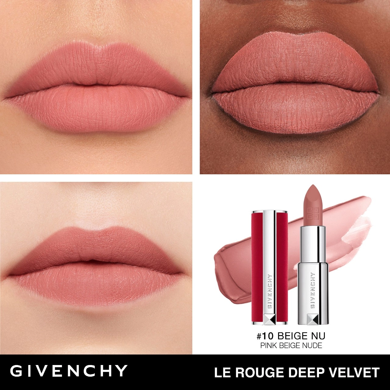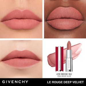 Experience the luxurious Givenchy Le Rouge Deep Velvet Matte Lipstick in the shade 10 Beige Nu – a stunning dusty rose nude. Encased in a red velvet bullet, this highly pigmented lipstick delivers a powdery-matte finish that lasts up to 12 hours.
