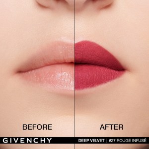 Experience the luxurious Givenchy Le Rouge Deep Velvet Matte Lipstick in the stunning shade 27 Rouge Infusé – a deep cerise red. This highly pigmented lipstick offers a powdery-matte finish that lasts up to 12 hours, providing you with long-wearing, customizable full coverage.