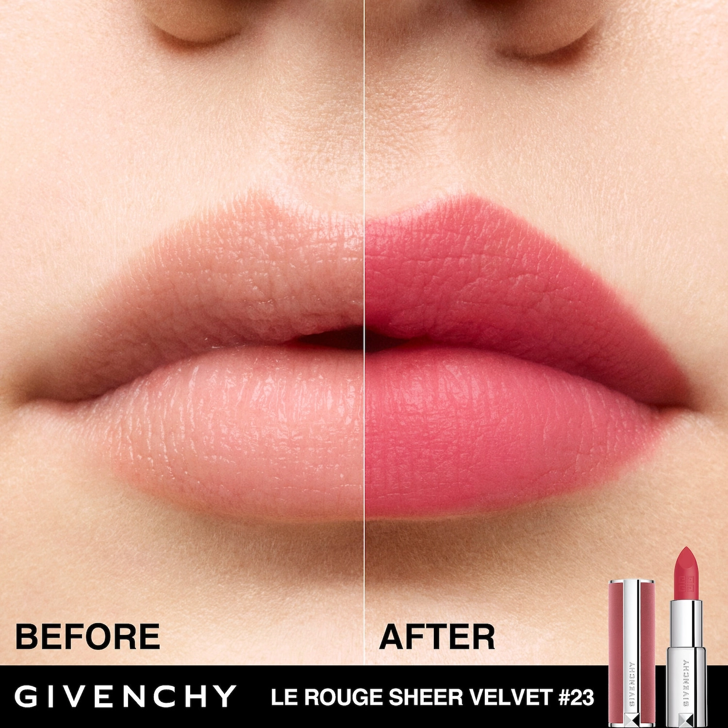 Start by applying the Givenchy Le Rouge Sheer Velvet Matte Lipstick to the upper lip, outlining the cupid’s bow, and then continue with the lower lip. To accentuate the blurred effect, lightly blot by gently tapping with your finger. For the ultimate lip routine, apply the Le Rouge Baume (sold separately) for up to 24 hours of hydration and a perfect sheer-matte pout. Blot away any excess before applying the Sheer Velvet Matte Lipstick.