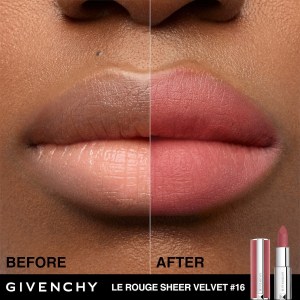 To achieve the perfect sheer-matte pout, start by applying the Givenchy Le Rouge Sheer Velvet Matte Lipstick to your upper lip, outlining the cupid’s bow, and then continue with the lower lip. To accentuate the blurred effect, lightly blot by gently tapping with your finger. For the ultimate lip routine, apply the Le Rouge Baume (sold separately) before the lipstick for up to 24 hours of hydration and a perfect sheer-matte finish. Blot away any excess before applying the Sheer Velvet Matte Lipstick for a flawless look.