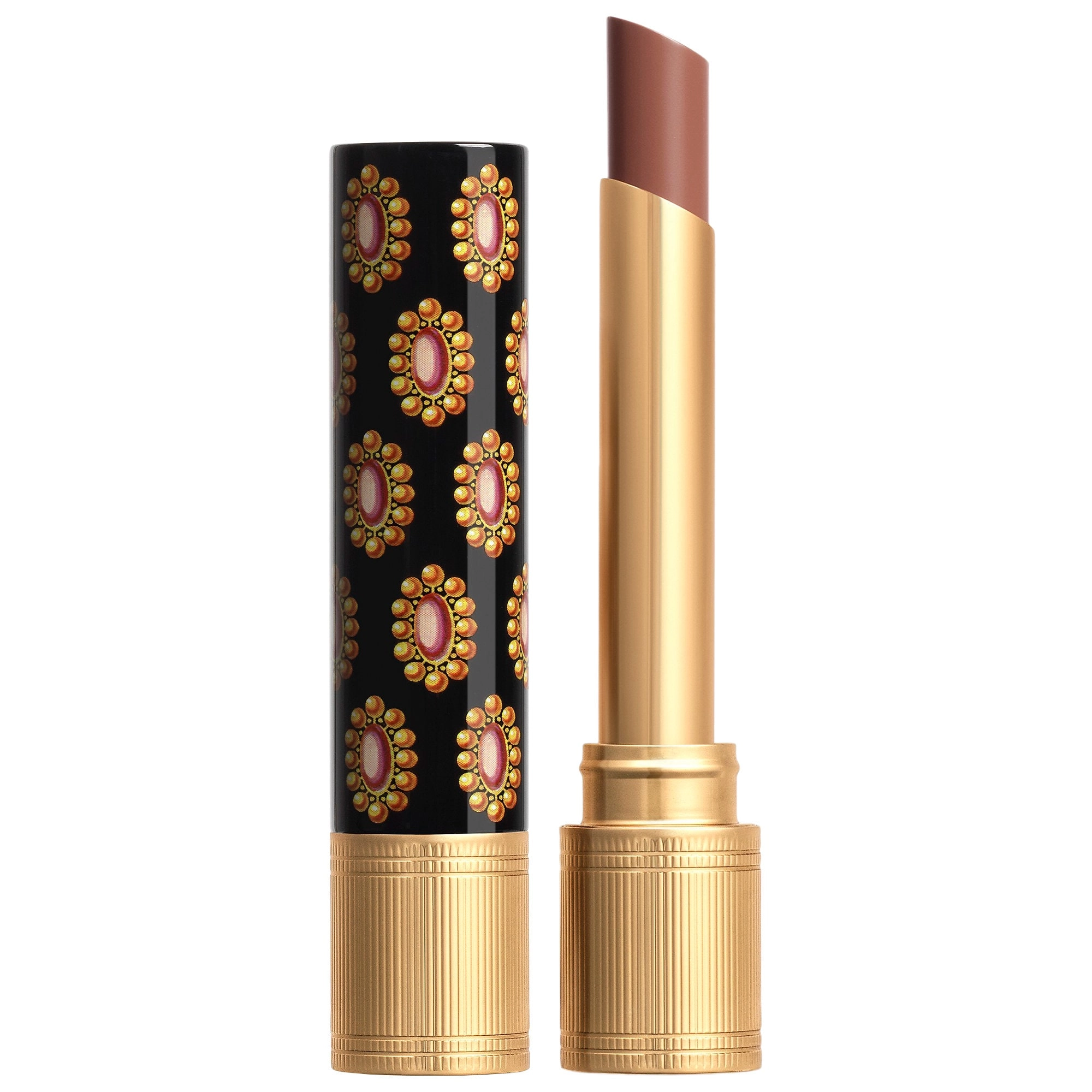 This Gucci lipstick is enriched with flower oils (black rose oil, peony oil, and jojoba seed oil) to nourish the lips while delivering high-shine color. Fruit butters moisturize the lips, while hyaluronic acid provides long-lasting hydration with a subtle yet visible lip-plumping and smoothing effect.