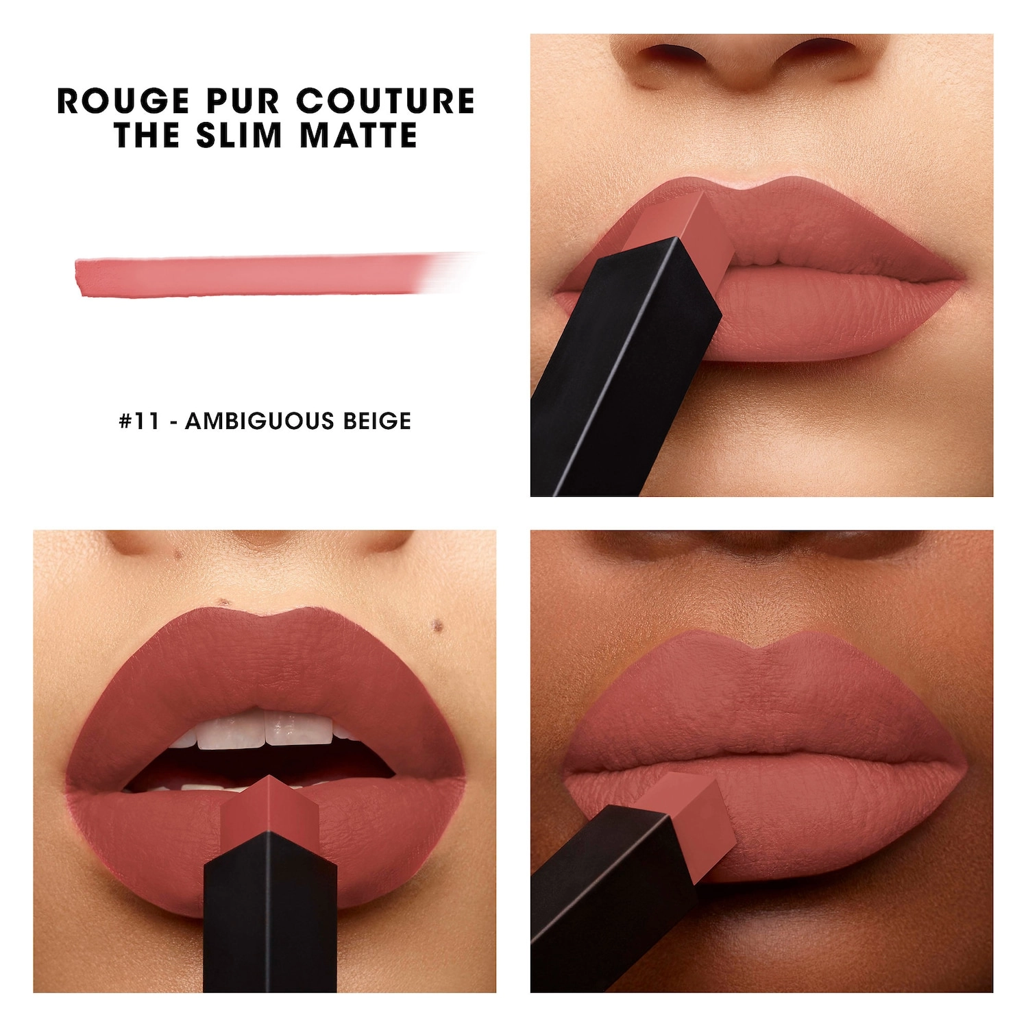 Experience the luxurious Yves Saint Laurent Rouge Pur Couture The Slim Matte Lipstick in the shade 11 Ambiguous Beige. This long-lasting matte lipstick features a highly pigmented formula that delivers intense color payoff. The innovative square bullet allows for easy application and precise lines, ensuring a flawless lip look every time.