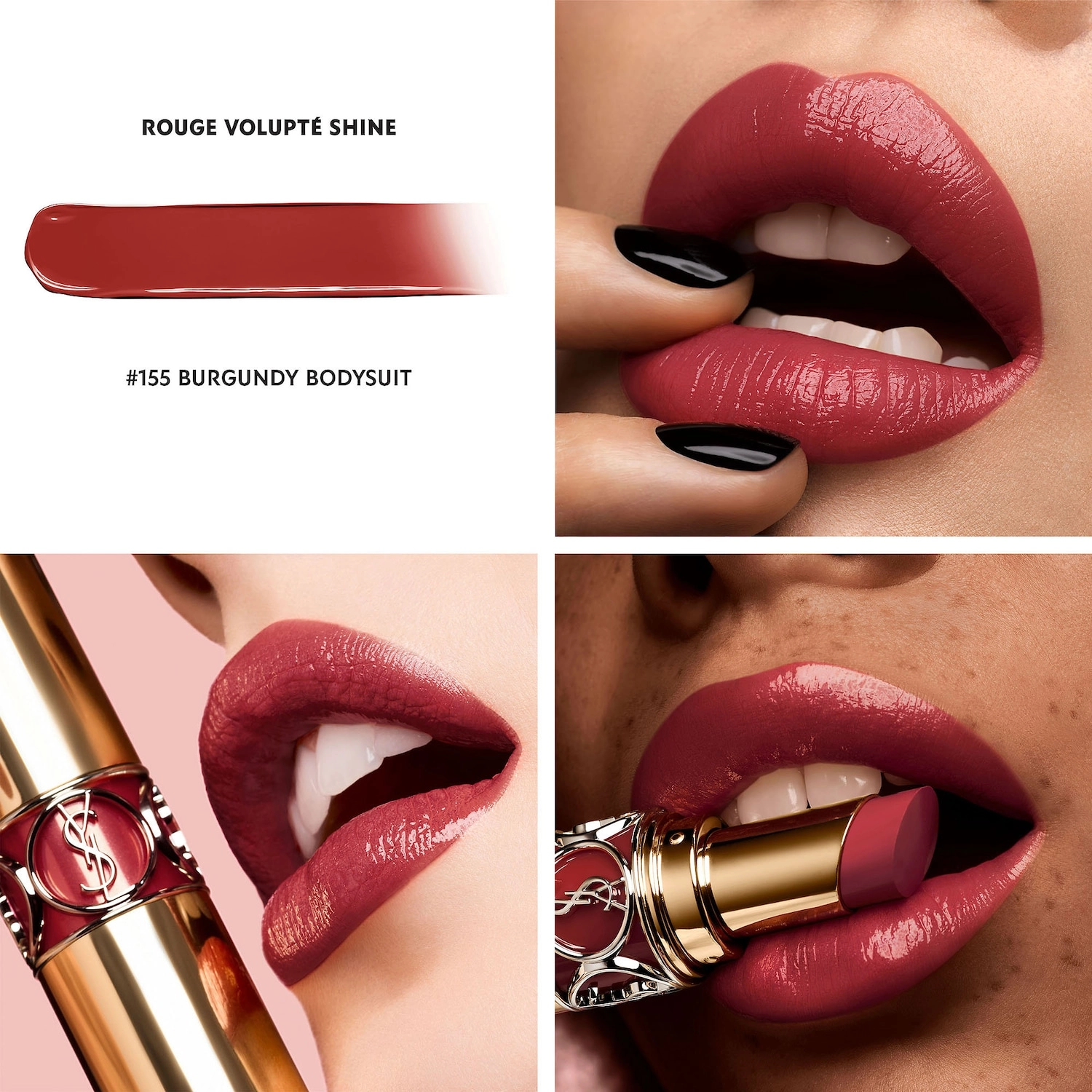 Indulge in the luxurious Yves Saint Laurent Rouge Volupté Shine Lipstick Balm in the shade 155 Burgundy Bodysuit. This medium-coverage lipstick balm offers a high-shine finish and a balm-like texture that conditions and moisturizes your lips.