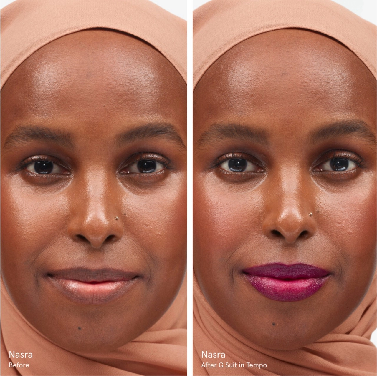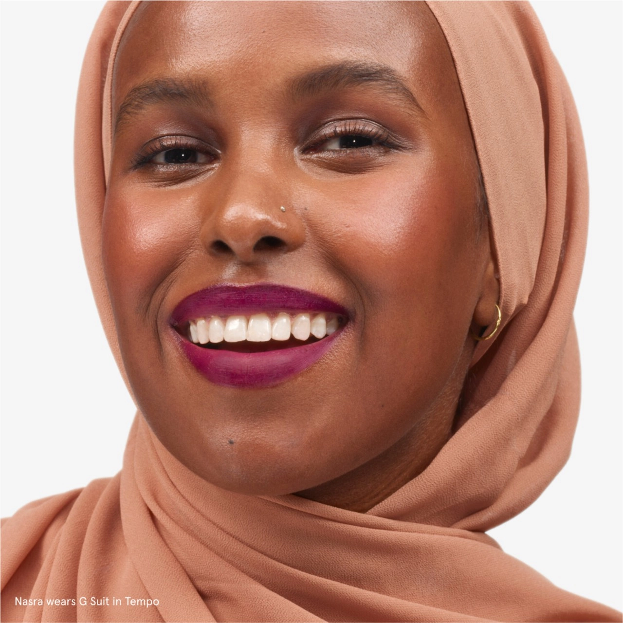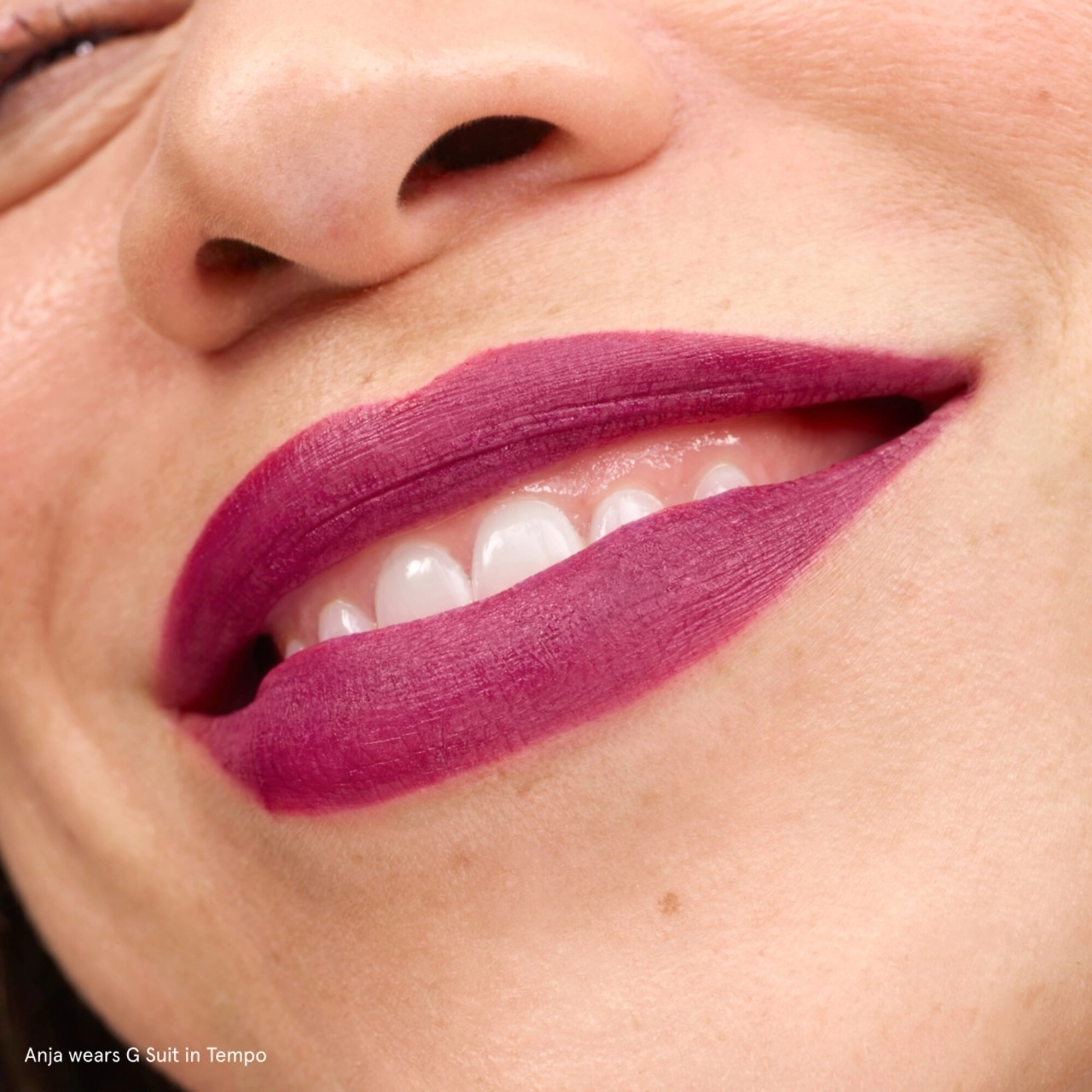 Get bold, velvety lips with Glossier G Suit Soft Touch Lip Crème in Tempo. This vegan lip crème features a hydrating matte finish and full coverage. The cream formula glides on like butter, leaving you with a high-impact payoff in one swipe. Perfect for any occasion, whether it’s your business suit, party suit, or birthday suit.