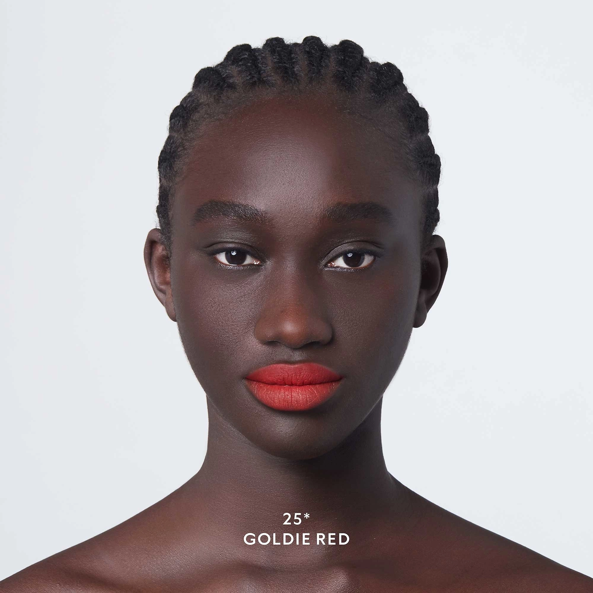 Elevate your makeup look with Gucci Transfer-Proof Matte Liquid Lipstick in Color 25* Goldie Red. Its highly pigmented, vibrant sunset shade provides optimal coverage and striking color, without settling into lip lines, smudging, or feathering, even on fabric. The weightless formula ensures a comfortable wear throughout the day.