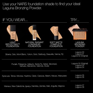 | – For fair and light complexions, select a Laguna Bronzer Powder with a neutral or warm undertone. For deeper complexions, select one with red or neutral undertones to enhance depth and dimension. | Synthetic Fluorphlogopite, Mica, Ethylhexyl Palmitate, Silica, Zinc Stearate, Dimethicone, Trimethylsiloxysilicate, Zinc Oxide, Sorbitan Sesquiisostearate, Tocopherol, Isopropyl Titanium Triisostearate, Chlorphenesin, [+/-(May Contain/Peut Contenir): Iron Oxides (Ci 77491, Ci 77492, Ci 77499), Titanium Dioxide (Ci 77891), Ultramarines (Ci 77007)]. |