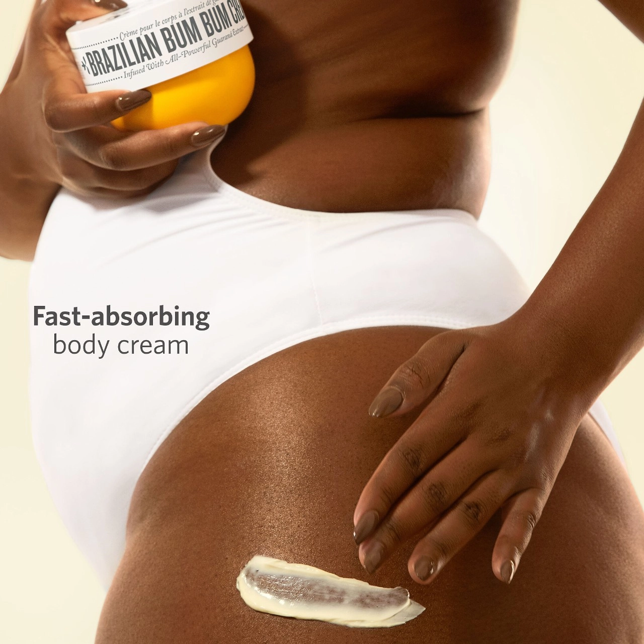 Experience the absolute body joy with Sol de Janeiro Mini Brazilian Bum Bum Cream. This fast-absorbing mini body cream is formulated with a tightening and smoothing formula that adds a hint of shimmer to your skin. It is perfect for those experiencing loss of firmness and dryness. Infused with Cupuaçu Butter, Açaí Oil, and Coconut Oil, this cream locks in moisture, restores skin’s elasticity, and helps your skin look and feel young.
