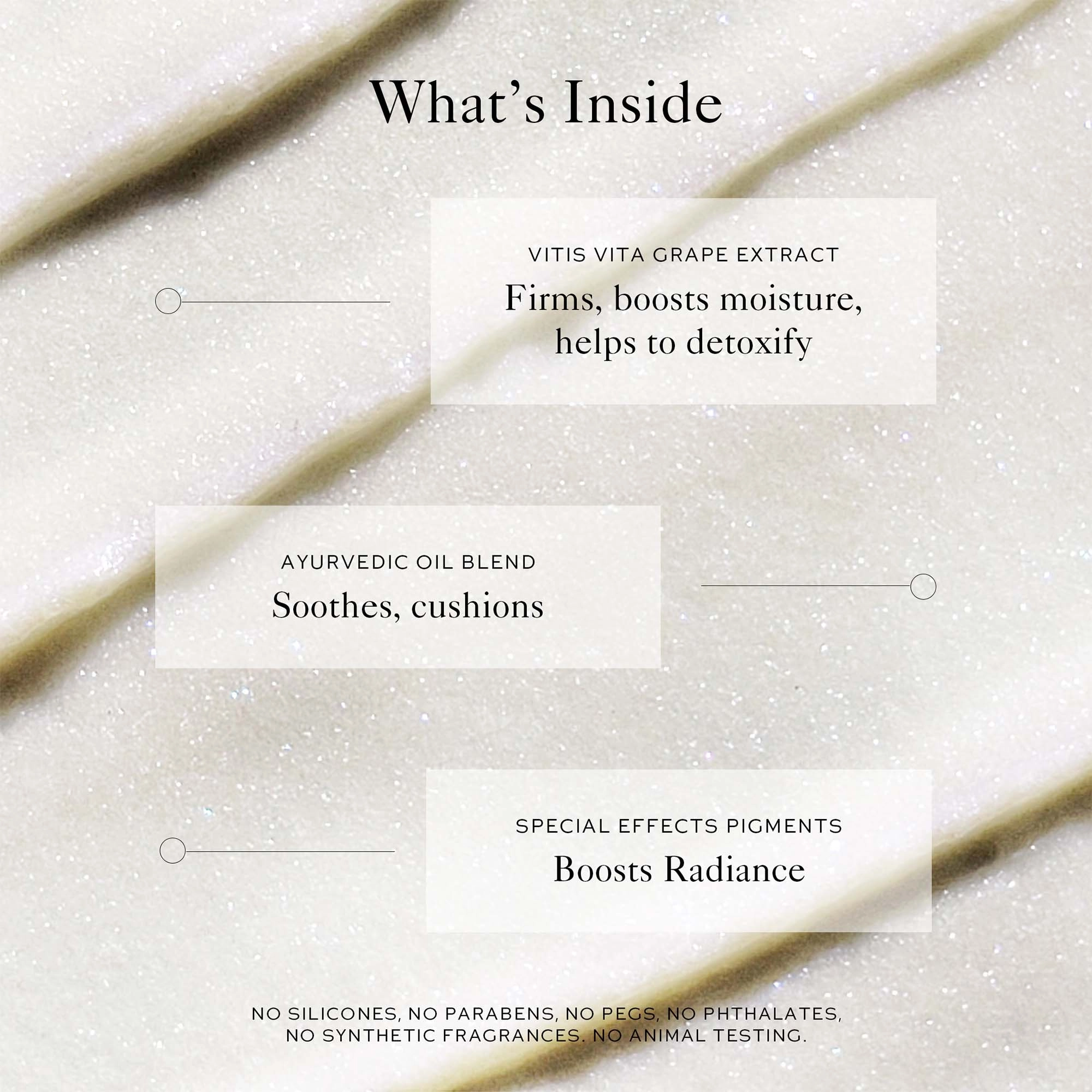 - Ayurvedic Oil Blend: Soothes, cushions, and supports skin’s moisture barrier.