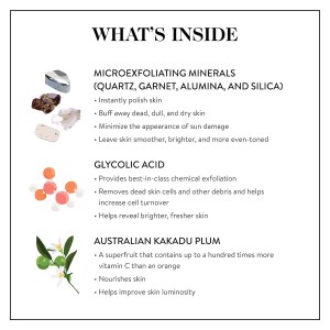 Micro-Exfoliating Minerals: Quartz, garnet, alumina, and silica work in harmony to instantly polish and refine the skin.