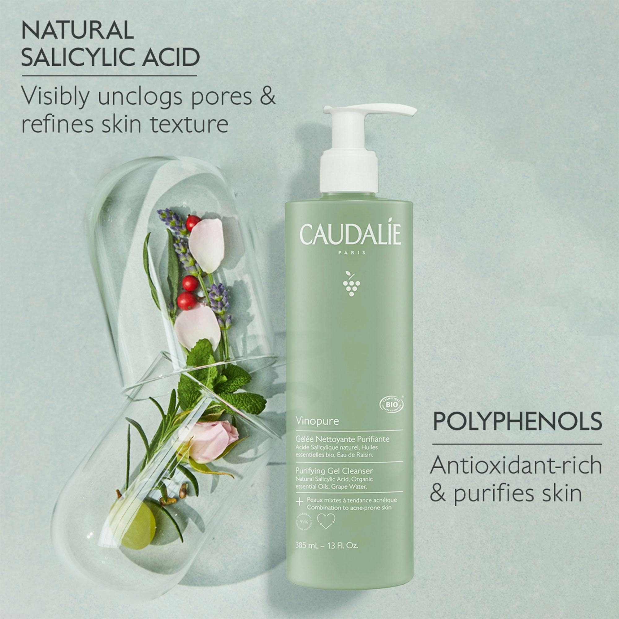 The Caudalie Vinopure Pore Purifying Gel Cleanser is a limited edition gel cleanser designed to purify your skin and absorb excess oil. With its non-drying formula and natural salicylic acid, it exfoliates your skin and visibly refines its texture. The gel-to-foam cleanser tightens pores, minimizes blackheads, and reduces breakouts. It is suitable for normal, combination, and oily skin types.