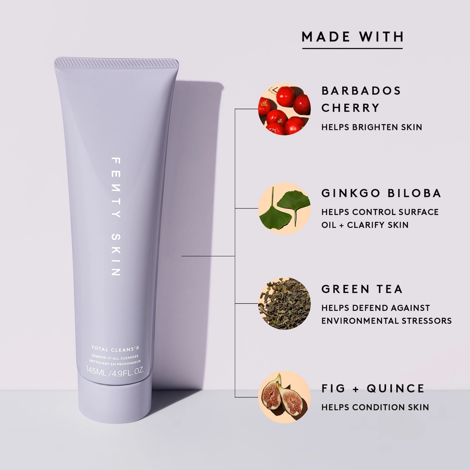 Elevate your skincare routine with the Fenty Skin Total Cleans’r Remove-It-All Cleanser with Barbados Cherry and experience the power of vitamin C, the clarifying benefits of Gingko Biloba, and the antioxidant protection of Green Tea. Get that fresh, clean feeling and radiant skin with Fenty Skin.