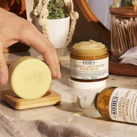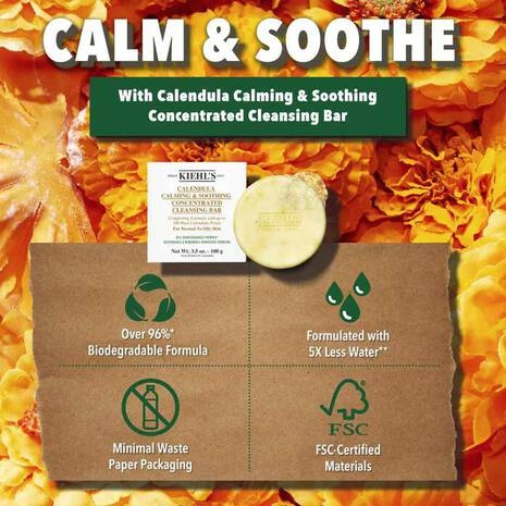 Experience the soothing power of Kiehl’s Since 1851 Calendula Calming & Soothing Concentrated Cleansing Bar. This facial bar is specially formulated with up to 100 naturally derived calendula petals, known for their skin-soothing properties. It creates a creamy-rich foam that cleanses sensitive and distressed skin, providing immediate relief from discomfort.