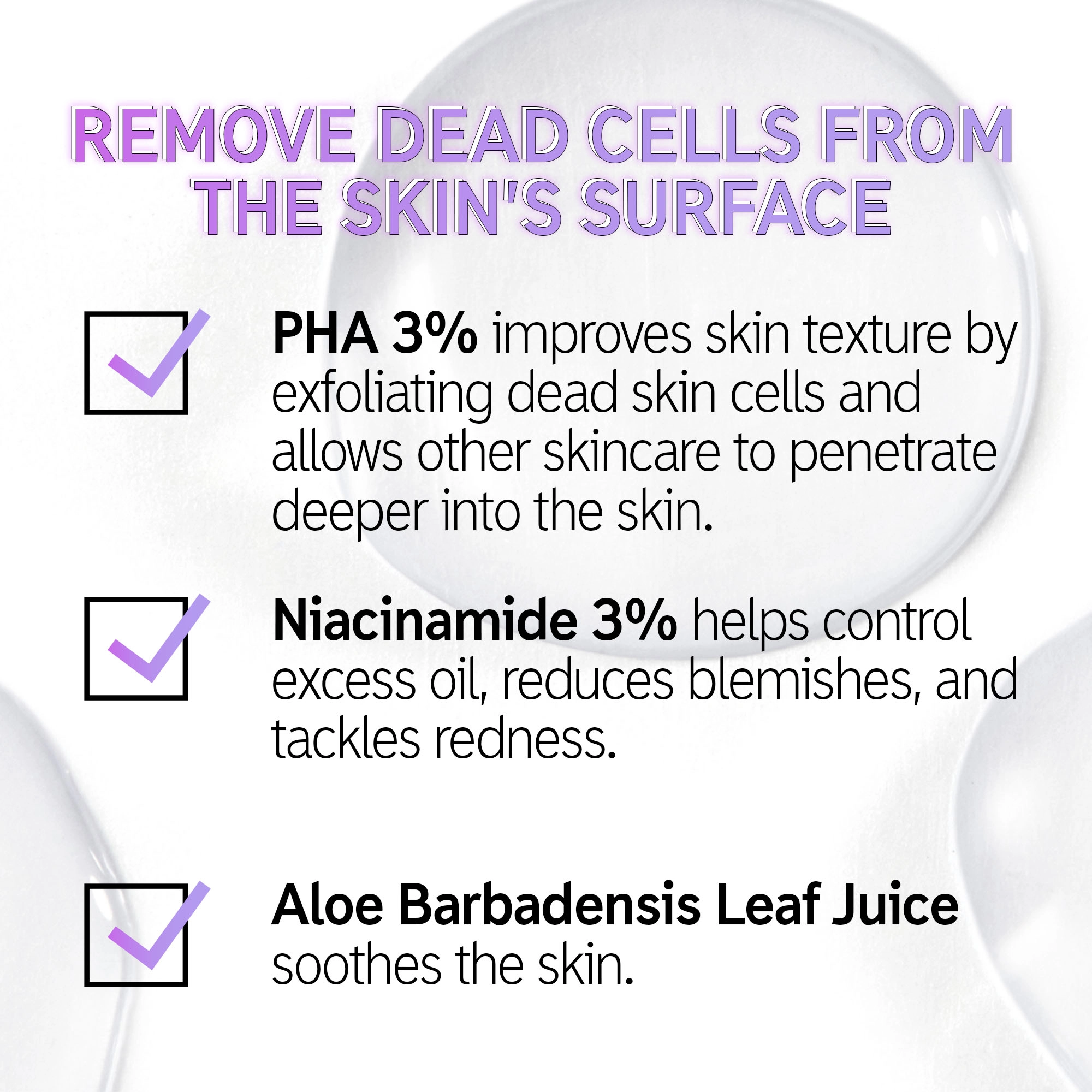 – PHA 3%: Improves skin texture by exfoliating dead skin cells and allows other skincare to penetrate deeper into the skin.