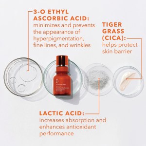 - 3-O Ethyl Ascorbic Acid: Minimizes and prevents the appearance of hyperpigmentation, fine lines, and wrinkles