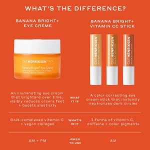 Diminish dark circles and brighten your under-eye area with OLEHENRIKSEN Banana Bright+ Vitamin CC Eye Sticks. These color-correcting eye cream sticks come in versatile shades to suit all skin tones. With enhanced Vitamin C and banana powder-inspired pigments, this vegan formula hydrates, illuminates, and fades the look of dark circles. Achieve a smooth base for concealer and neutralize unwanted tones for a flawless complexion. Say goodbye to tired-looking eyes and hello to a brighter, more youthful appearance.