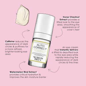 Revitalize your tired-looking eyes with Sunday Riley Autocorrect Brightening and Depuffing Eye Contour Cream. This cream is specially formulated to improve the appearance of dark circles and eye bags, leaving you with a brighter, firmer, and more illuminated look. With its caffeine, Brazilian ginseng, and horse chestnut blend, it invigorates tired eyes and reduces puffiness. Watermelon extract provides hydration and smooths the look of lines, while antioxidant-rich lutein offers blue-light support for the delicate eye area.