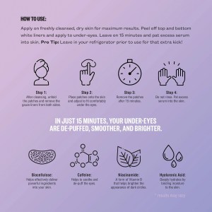 These under-eye patches are formulated with caffeine to minimize the appearance of puffiness, niacinamide to brighten dark circles, and hyaluronic acid to hydrate the skin. They are free of harmful ingredients and are suitable for all skin types.