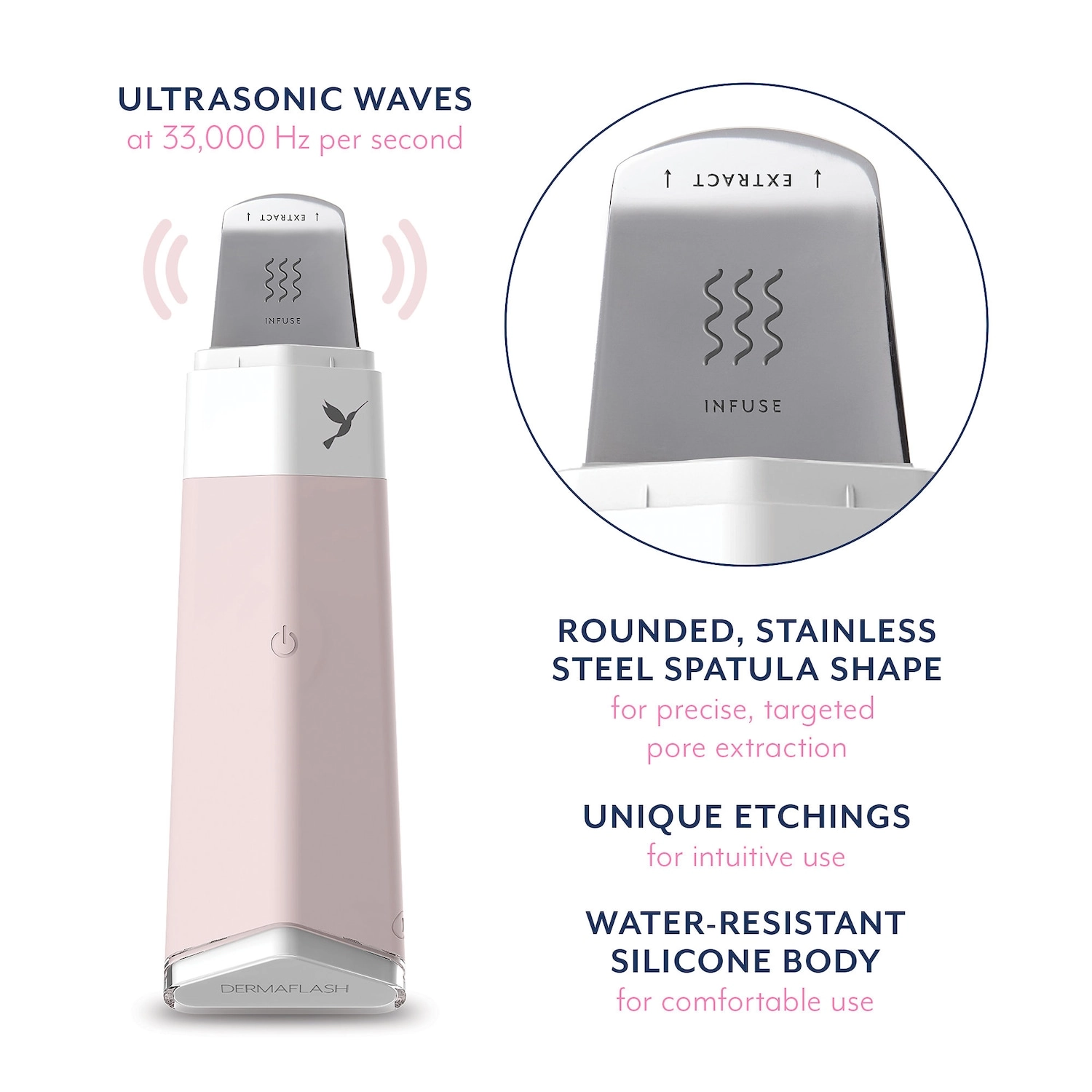 Reveal clearer, cleaner, and healthier-looking skin with the DERMAFLASH DERMAPORE Ultrasonic Pore Extractor & Serum Infuser. This powerful ultrasonic device utilizes advanced technology to quickly unclog pores and enhance the penetration of your favorite serums, masks, and moisturizers. Its unique custom-curved spatula effortlessly navigates over your nose, chin, and forehead to remove blackheads, dirt, oil, and debris for a painless extraction process.