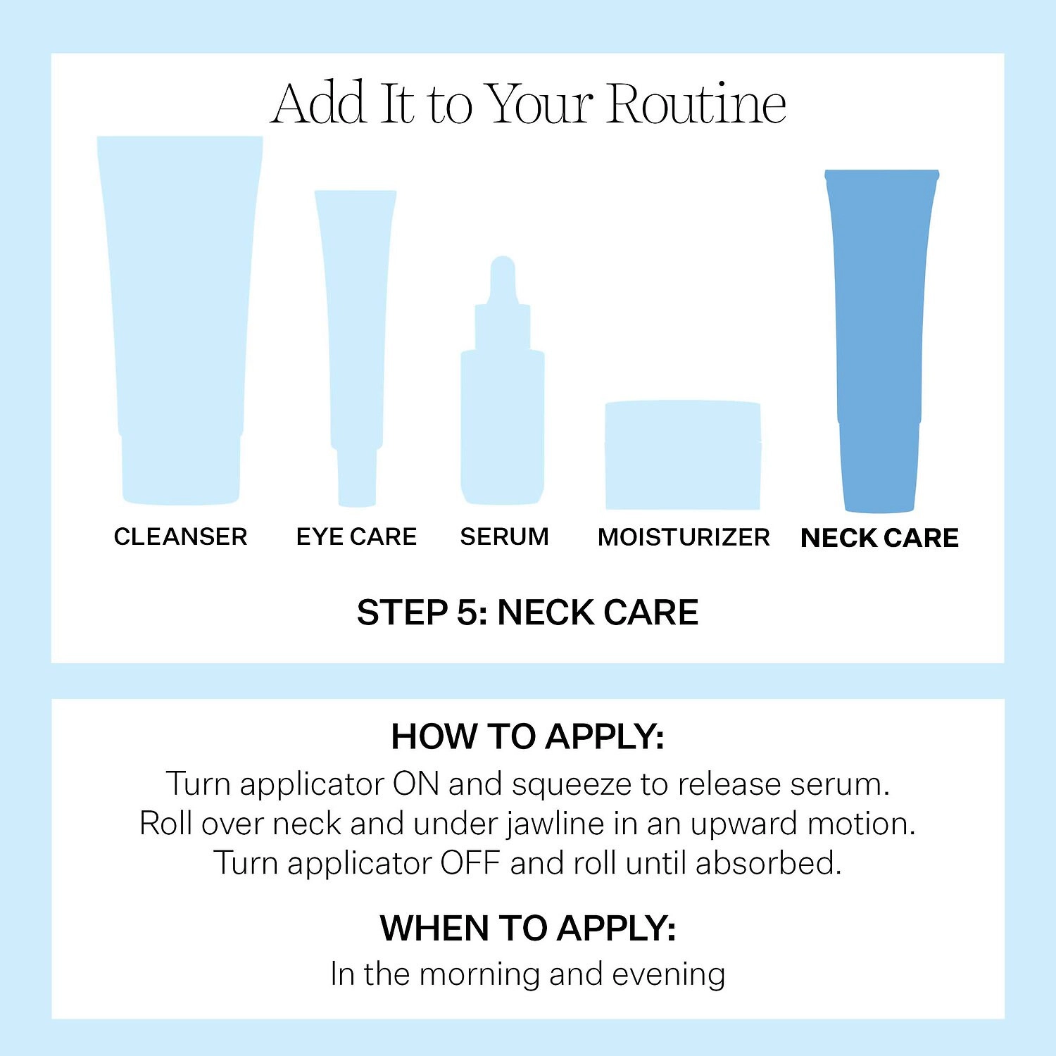 - Gently roll the serum over the neck and under the jawline in an upward motion.