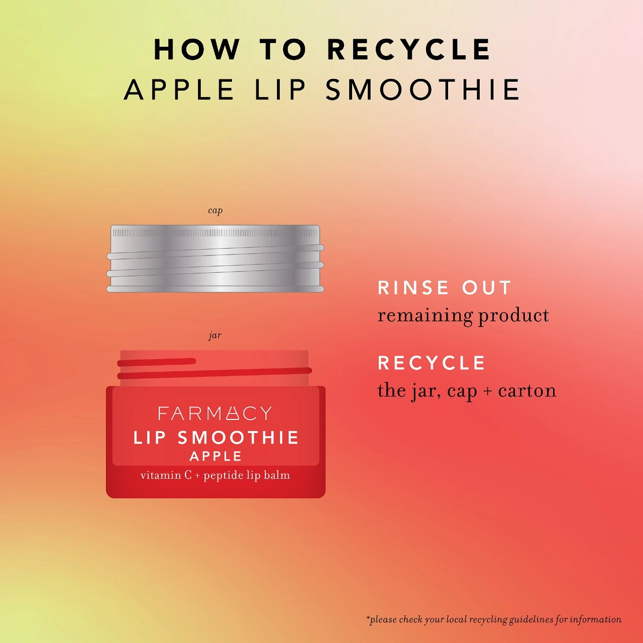 Apply Farmacy Apple Lip Smoothie Vitamin C + Peptide Lip Balm as needed. For external use only. Pro tip: Use it as a lip primer or on top of lipstick for a glossy finish.