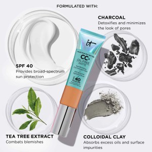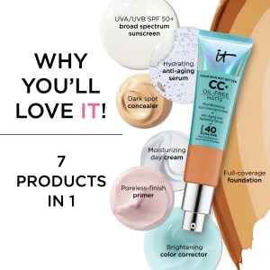 To achieve the best results, apply one to two pumps of this tinted moisturizer to clean skin using IT Cosmetics’ Heavenly Skin™ CC+™ Skin Perfecting Brush #702 (sold separately). Focus on the parts of your face that may need the most coverage first, such as under your eyes, around your nose and mouth, chin, and center of forehead. This foundation can be used as a full-coverage foundation, SPF 40 sunscreen, visibly brightening color corrector, hydrating serum, pore-less finish primer, visible dark spot concealer, or moisturizing cream. For a long-lasting, full-coverage makeup look, pair with IT Cosmetics’ Your Skin But Better Makeup Primer and CC+ Airbrush Perfecting Powder (each sold separately).