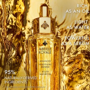 Hydrate, plump, and boost radiance with GUERLAIN Abeille Royale Advanced Youth Watery Oil. This multitasking facial oil is formulated with 95% naturally derived ingredients to soften fine lines and wrinkles, while visibly improving skin texture. Suitable for all skin types, this lightweight oil is a 3-in-1 powerhouse that hydrates, smooths, and rejuvenates the skin. Experience the power of Dynamic Black Bee Repair Technology, Guerlain Exclusive Royal Jelly, and Commiphora Oil for a youthful, radiant complexion.