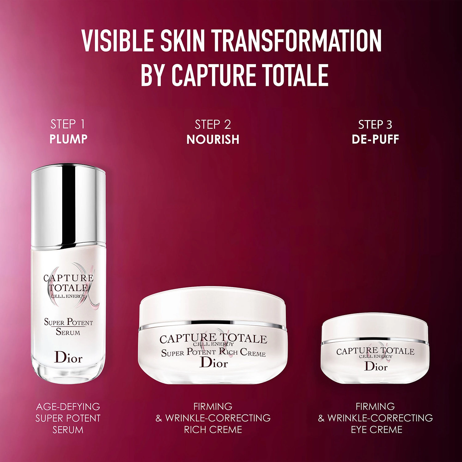 For best results, apply the Dior Capture Totale Super Potent Rich Cream to your face and neck every morning and evening after using the Capture Totale Super Potent Age-Defying Intense Serum (sold separately). Massage gently into the skin until fully absorbed.