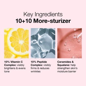 Experience the ultimate skincare transformation with the iNNBEAUTY PROJECT 10 + 10 Moisturizer. This luxuriously creamy and hydrating daily moisturizer is packed with powerful ingredients to deliver more than just moisture. The 10% Vitamin C Complex combines two forms of stable, oil-soluble vitamin C to visibly brighten and even skin tone. The 10% Peptide Complex visibly firms, tightens, smooths, and reduces wrinkles for plump and bouncy-looking skin. Ceramide NP and Squalane support the skin’s moisture barrier by keeping hydration in and pollution out.