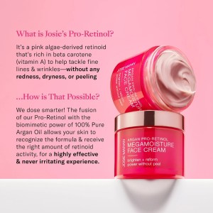 Experience the power of Josie Maran Pro-Retinol Megamoisture Face Cream. This luxurious face cream is formulated with pro-retinol and sodium hyaluronate to visibly reduce wrinkles and provide all the benefits of retinol without any irritation. Suitable for all skin types, this cream is perfect for those concerned about dark spots, uneven texture, and loss of firmness and elasticity.